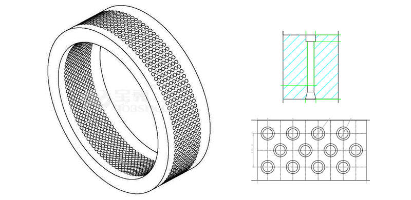 模孔的排布方式也是環(huán)模設(shè)計(jì)里面一個(gè)很重要的問題。根據(jù)制粒對(duì)象的不同,顆粒料的大小也不同,但是一旦制粒對(duì)象確定后,顆粒料的大小就基本確定,??椎拇笮∫部梢源_定下來了。
